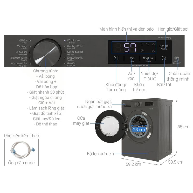 | Tiện ích | Khóa trẻ em, Hẹn giờ giặt, Chẩn đoán lỗi Smart Diagnosis |